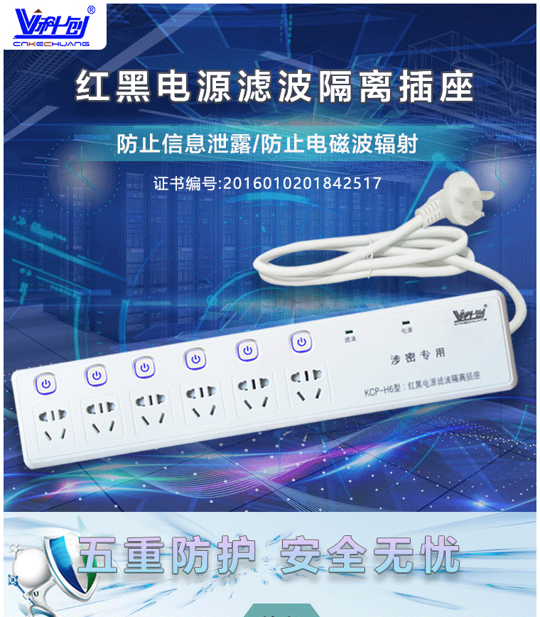 科创 红黑电源隔离插座 6孔位3米线插座 防泄密 防电磁辐射 KCP-H6