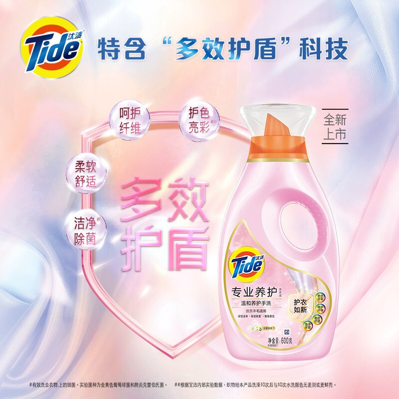 商品名称:汰渍 Tide 专业温和养护手洗洗衣液600G/瓶 洁净除菌 适用于真丝 羊毛材质 内衣适用 柔软衣物 温和不伤手 500G*5瓶